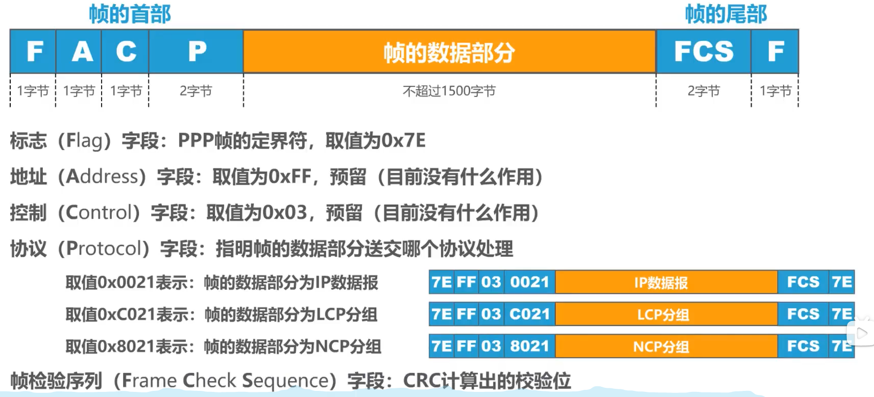 PPP 协议为在点对点链路传输各种协议数据报提供了一个标准方法,主要由以下三部分构成: