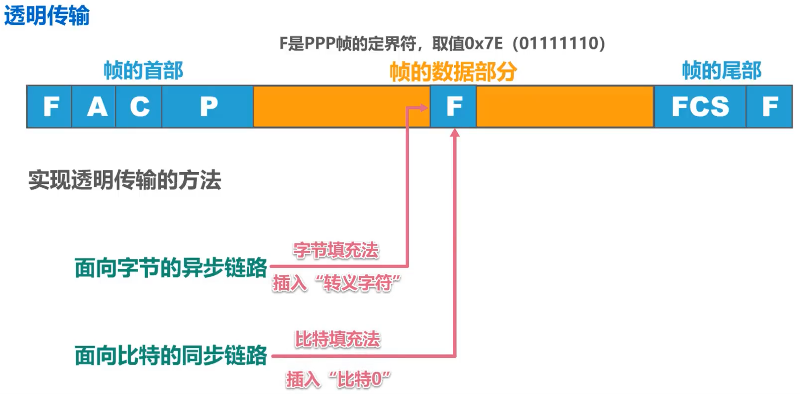 由上图,F 字段是 PPP 帧的定界符,如果不对数据部分的 F 字段做特殊处理,就会导致接收方对帧头和帧尾的误判。实现透明传输的方法根据链路的不同分为“字节填充法”和“比特填充法”。