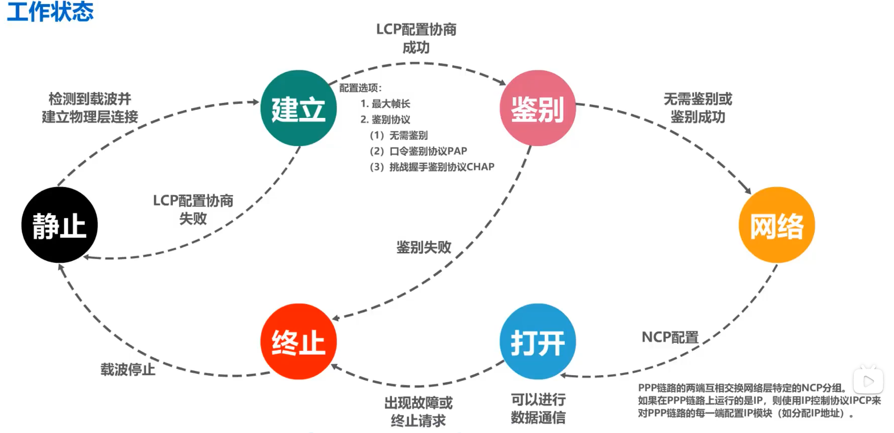 - 链路控制协议 LCP 用于建立、配置以及测试数据链路的连接